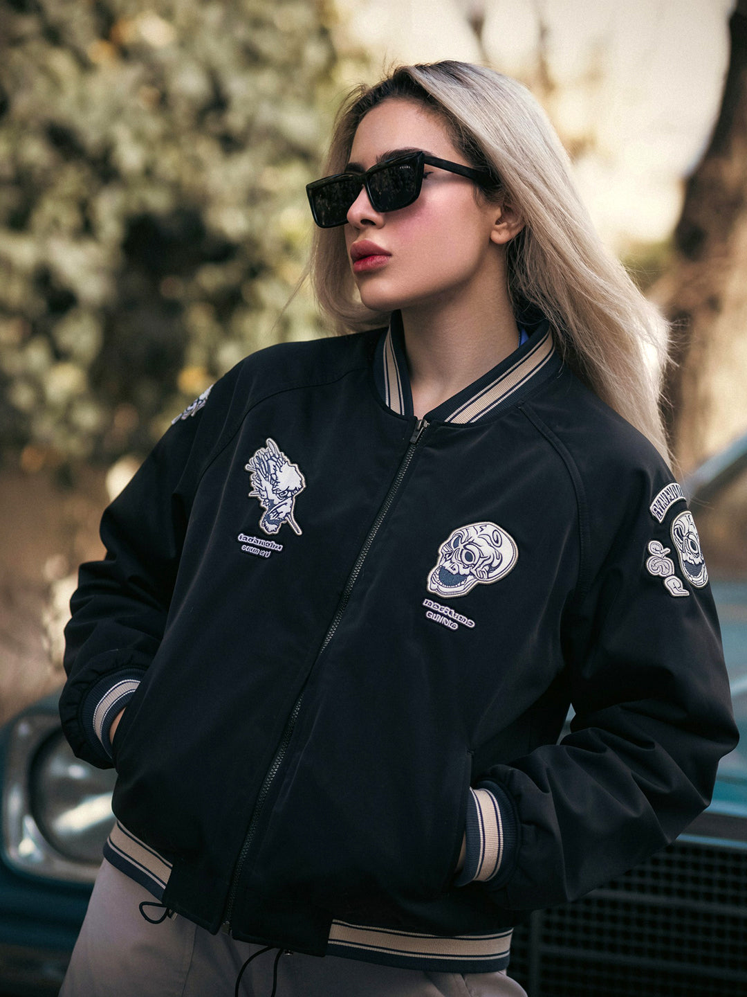 • 【L】Blue Crane Embroidery / Black Dragon & Japan Map – Japanese Quilted Bomber