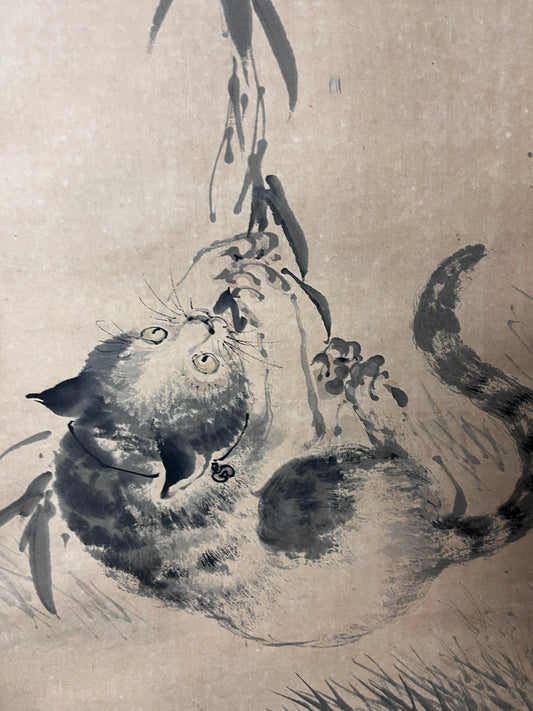 Hand-Painted [Cat and Bamboo] *Japanese Painting. Hanging Scroll ・Cat Playing with Bamboo Leaves *Cat Illustration *Artwork with a Sense of Age Artist Unknown