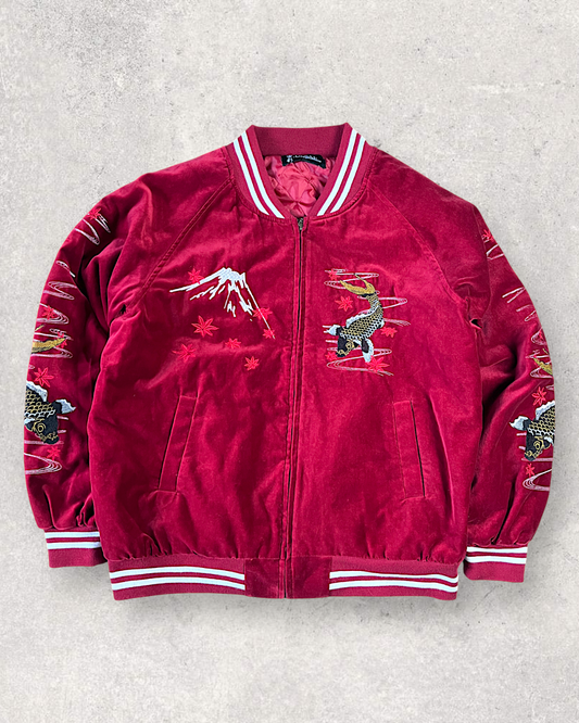 【3L/Deep Crimson】Japanese Sukajan with Koi Fish & Mt. Fuji Embroidery|UNSAI Brand|Rare Oversized Jacket Piece