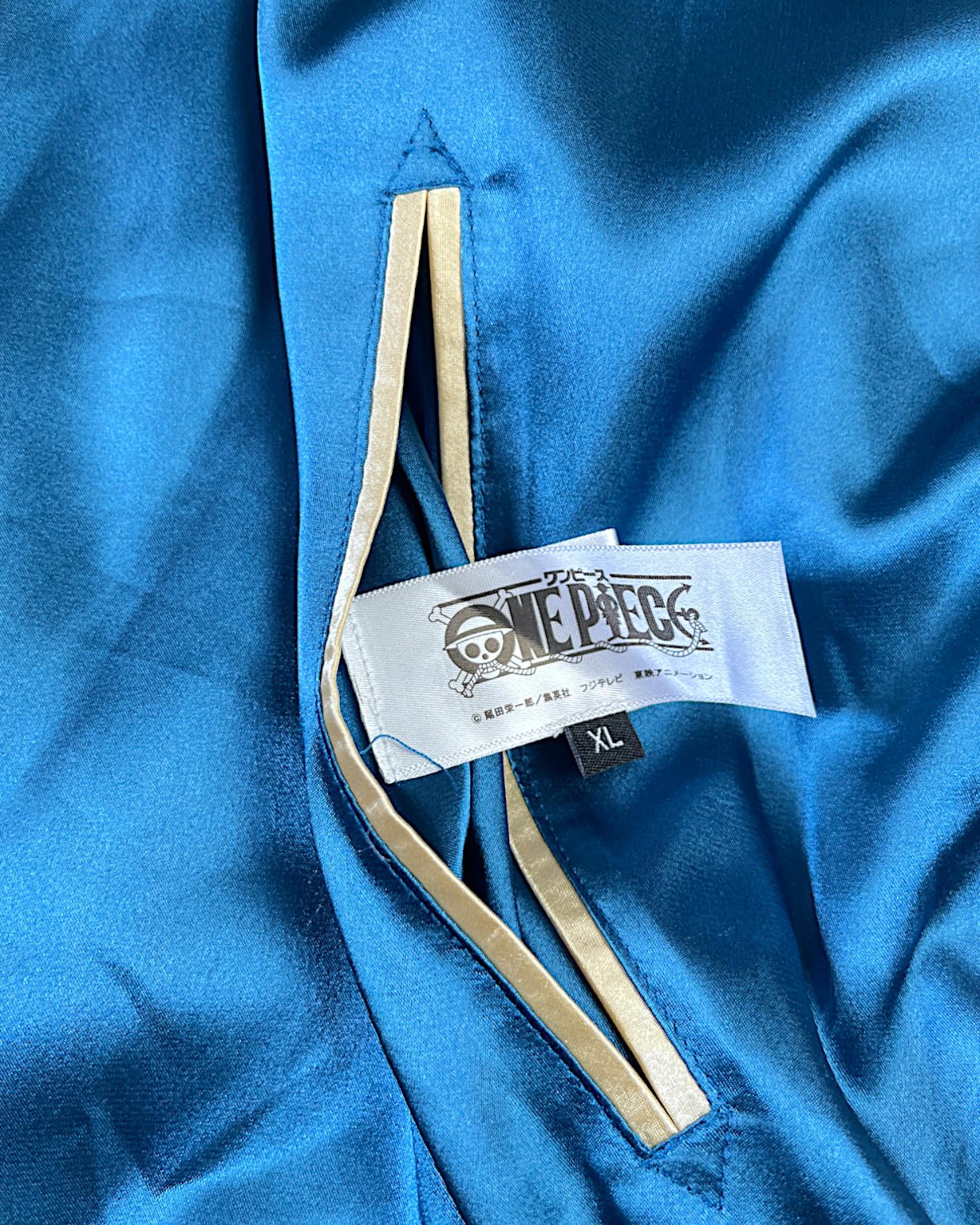 This ultra-rare reversible sukajan jacket features Tony Tony Chopper from the world-renowned anime ONE PIECE. Designed in brilliant metallic blue and ivory satin, this jacket stands out with its colorful embroidered front and back, making it a true collectible piece for anime lovers and fashion enthusiasts.