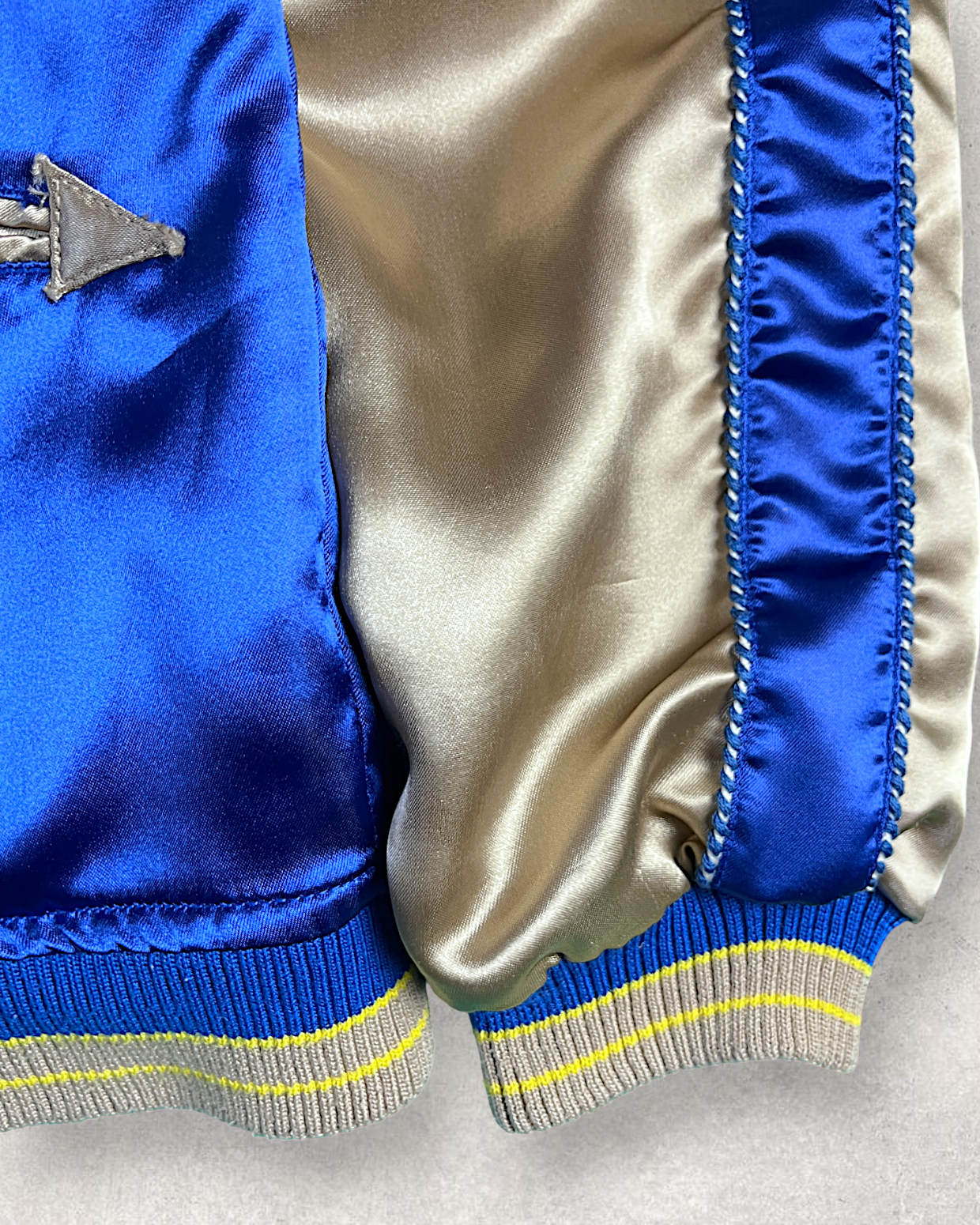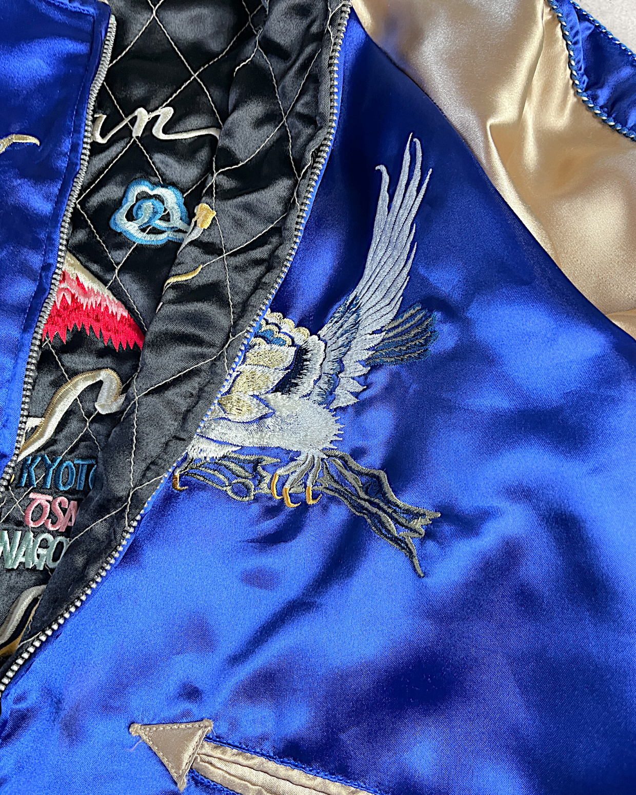 This reversible Sukajan jacket in size L features two completely different Japanese designs in one unique piece. The blue side showcases an elegant crane embroidery with glossy champagne-gold sleeves, while the reverse side transforms into a bold black quilted jacket decorated with a vibrant dragon, Mt. Fuji, waves, and a full Japan map.