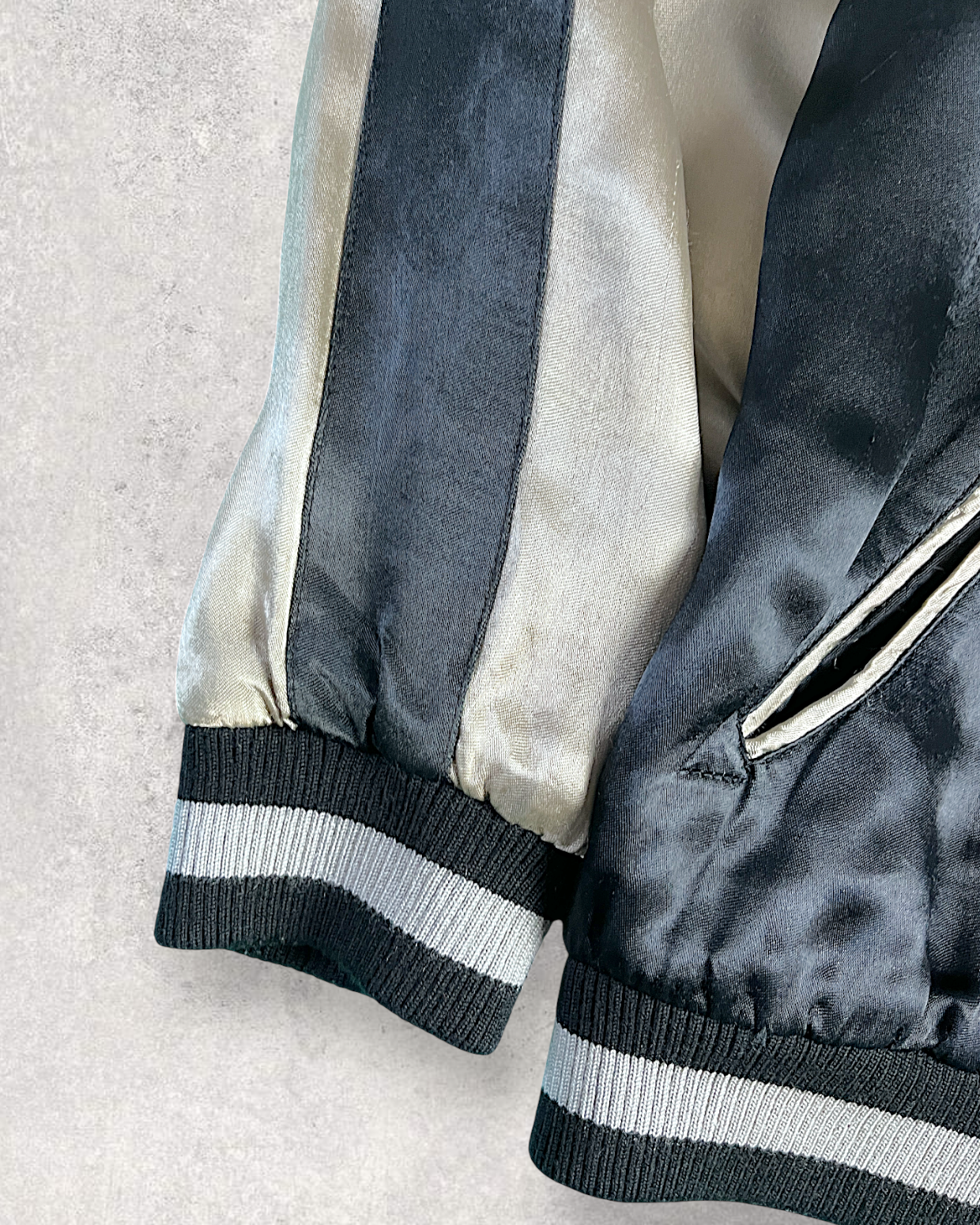 DetailThis stunning M reversible sukajan showcases an intricate dragon soaring through swirling clouds on a luxurious black and gold satin-like rayon fabric.