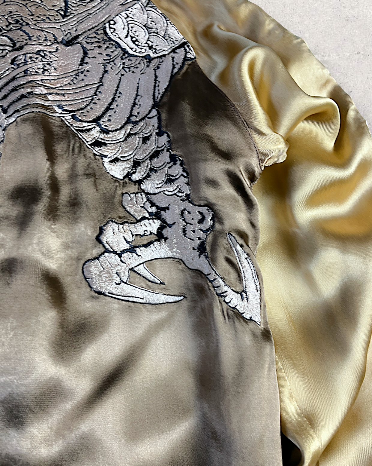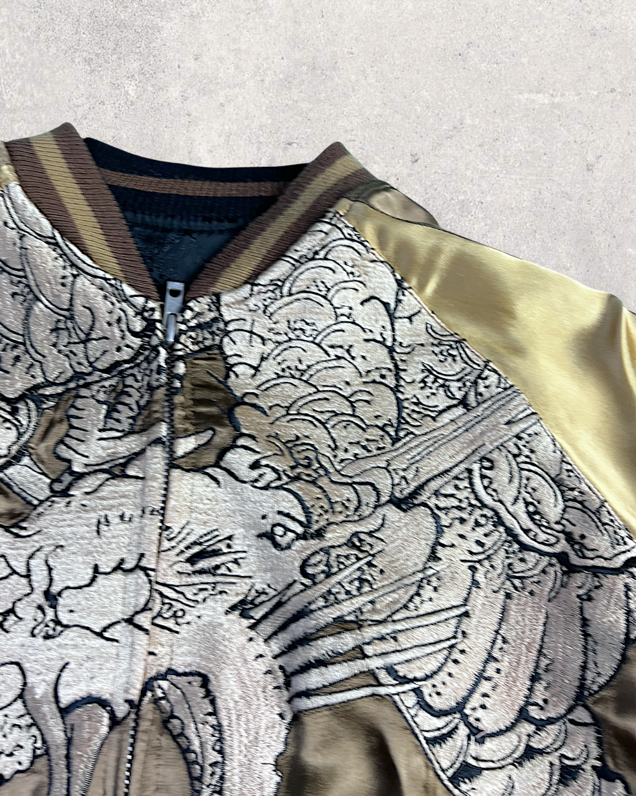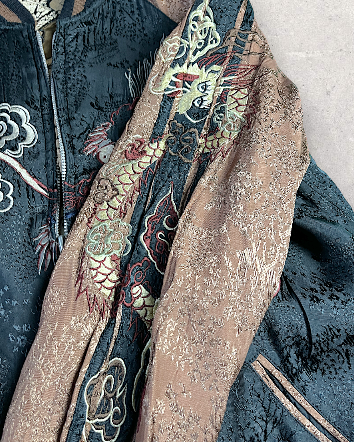 This reversible Sukajan jacket in size L features two striking dragon-themed designs, offering a completely different look on each side. The front side showcases a rare gold and silver gradient satin fabric, decorated with a large, detailed dragon embroidery that delivers strong visual impact and traditional Japanese elegance.