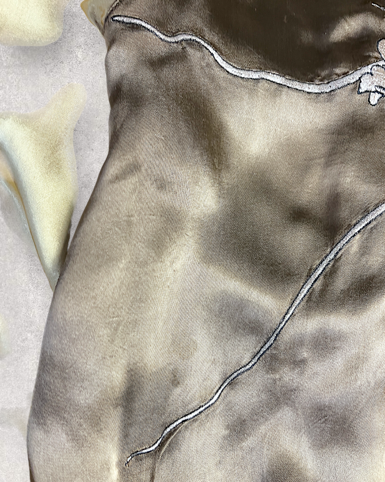 - Front (Gold × Silver Gradient): Rare gradient satin fabric, large dragon embroidery across the body, and cloud-pattern stitching on the sleeves.